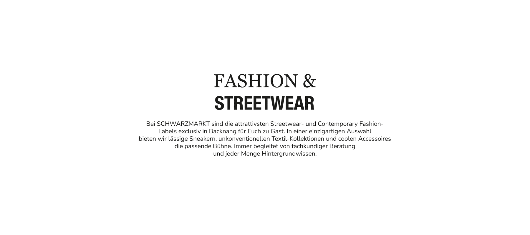 Bei SCHWARZMARKT kommt seit 1994 zusammen, was wir lieben. Streetwear und Contemporary Fashion mit Stil und Qualitätsanspruch. Authentische Marken, die unsere Herzen höher schlagen lassen. Inspirationen aus den internationalen Style-Hotspots, die uns immer wieder neue Seiten an uns entdecken lassen. In unserem Store in Backnang kommt jahrzehntelange Erfahrung mit Herzblut und Enthusiasmus zusammen. Wir bei SCHWARZMARKT verstehen uns als Treffpunkt für Menschen mit individuellem Charakter, die sich lieber inspirieren und kompetent beraten als bevormunden lassen. Schaut vorbei und verliebt Euch in Eure neuen Lieblingsstücke!